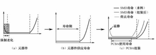 PCBA 組裝失效率曲線:如圖 1(c)所示。它由 SMD 來料壽命、SMD 組裝壽命和焊點壽命 3 部分共同影響。此時 PCBA 的使用壽命基本上取決于焊點壽命。因此,確保每一個焊點的焊接質(zhì)量是確保系統(tǒng)高可靠性的關(guān)鍵環(huán)節(jié)。